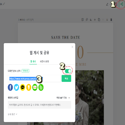미리캔버스에서 셀프로 모바일 청첩장 디자인을 완성했다면 결혼식에 초대하고 싶은 지인들에게 공유할 수 있다. 편집 영역 윗부분에 공유 아이콘을 누르면 '웹 게시 및 공유' 창이 뜨는데 이때 2번 위치에 있는 곳을 클릭하면 초록색 버튼으로 바뀌면서 디자인 문서 공개가 가능한 URL주소가 나온다. 미리캔버스에서 만든 모바일 청첩장은 만료 기간이 별도로 없고 무료로 만들 수 있어 좋다. 공유 뷰어에서 댓글을 활성화하면 축하 메시지도 받아볼 수 있으니 시간이 지나도 결혼식의 추억을 간직할 수 있다.(댓글은 로그인해야 작성이 가능하다.)