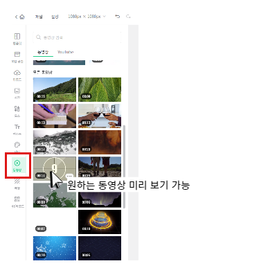 미리캔버스에 있는 동영상이 필요할 경우 작업창에서 동영상을 클릭하면 바로 다양한 영상들이 나온다. 이때 영상을 일일이 클릭해서 장면을 확인하지 않고 마우스를 영상 위에 올려두기만 해도 자동적으로 플레이가 되어서 미리보기가 가능하다. 영상을 선택해서 디자인 편집 영역에 두고 크기와 위치를 조절한 뒤 영상 길이도 편집이 가능하다. 영상 편집 프로그램처럼 중간 삭제 및 붙이기 기능은 없고 단순히 영상 길이(시간) 편집만 가능하다. 사실 미리캔버스에 있는 영상들이 전문가의 작품이라 동영상 길이 편집만 필요하지 다른 편집은 필요하지 않을 듯하다.