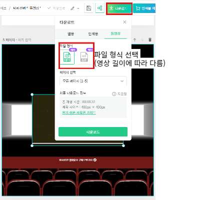 미리캔버스에서 작업한 일반 디자인들은 웹용 또는 인쇄용으로 나뉘어 PDF, JPG, PNG 파일로 저장하지만 동영상을 넣은 디자인이라면 파일 형식을 다르게 저장해야 한다. 미리캔버스 홈페이지 윗부분에 '다운로드'를 클릭하면 '웹용', '인쇄용', '동영상'으로 나뉘는데 그중 동영상을 선택한다. 여러 페이지를 디자인했을 경우 동영상 있는 페이지를 선택해 동영상으로 별도 저장이 가능하다.(페이지마다 제목을 적어두면 나중에 파일을 찾을 때 편하다.) 동영상은 'MP4'와 'GIF' 형식으로 나뉘는데 MP4는 시간이 긴 영상도 저장 가능하지만 GIF는 10초까지만 영상이 저장되기 때문에 10초 안으로 재생시간을 편집해야 저장이 가능하다.