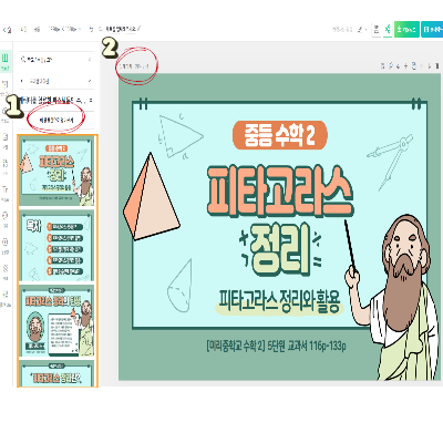 PPT를 만든다면 반드시 '템플릿 덮어쓰기'를 주의하고 꼭 다른 디자인 템플릿의 일부가 필요할 경우 새로 온 페이지를 추가하고 난 뒤 클릭하여 힘들게 만든 페이지가 사라지는 일은 없도록 하자. 헷갈리지 않게 아래 사진의 2번 위치에 있는 곳에 페이지 제목을 써서 수정할 때 찾기 쉽도록 구분 지어놓자.